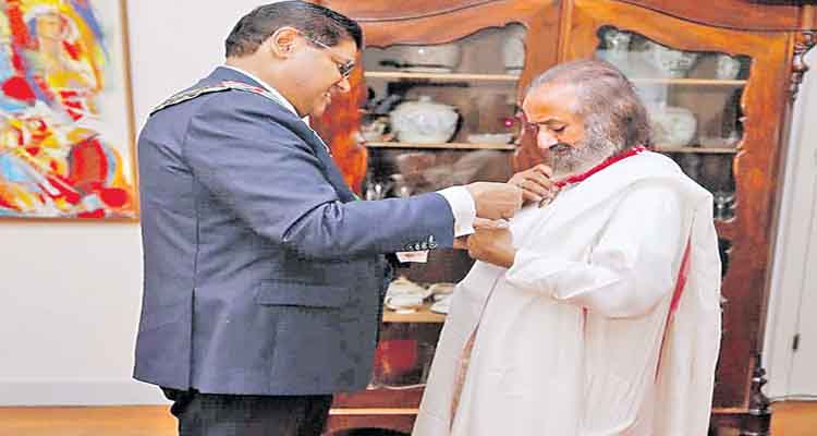 ప్రపంచ ప్రఖ్యాత ఆధ్యాత్మిక గురువు, ఆర్ట్ ఆఫ్ లివింగ్ సంస్థ వ్యవస్థాపకులు శ్రీశ్రీ గురుదేవ్ రవిశంకర్కు అరుదైన గౌరవం దక్కింది. దక్షిణ అమెరికా తీరప్రాంత దేశమైన సురినామ్ తమ దేశ అత్యున్నత పౌర అవార్డు ఆనరరీ ఆర్డర్ ఆఫ్ ది ఎల్లో స్టార్ అవార్డుతో రవిశంకర్ను సత్కరించింది. సురినామ్ అధ్యక్షుడు చంద్రికా ప్రసాద్ సంతోఖి ఈ అవార్డును ఆయనకు అందజేశారు. ఇప్పటి వరకూ దేశాధిపతులకు మాత్రమే ఇచ్చిన ఈ అవార్డు మొట్టమొదటిసారి ఓ ఆధ్యాత్మికవేత్త, ఆసియావాసి అందుకొన్నారు. ఈ అవార్డును అందుకున్న మొదటి ఆసియావాసి గురుదేవ్ రవిశంకర్ కావడం మరో విశేషం. ఇప్పటి వరకూ దేశాధిపతులకు మాత్రమే ఇచ్చిన ఈ అవార్డు మొట్టమొదటిసారిగా ఒక ఆధ్యాత్మిక గురువుకు బహుకరించారు. సురినాయ్ అధ్యక్ష భవనంలో జరిగిన ఈ కార్యక్రమంలో అక్కడి భారత రాయబారి డాక్టర్ శంకర్ బాలచంద్రన్ పాల్గొన్నారు.