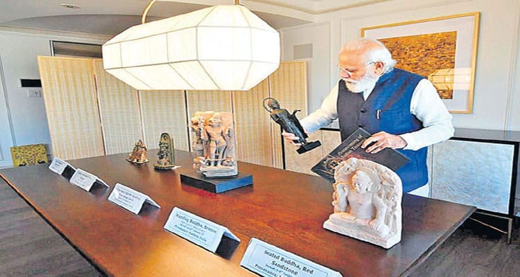 అమెరికా పర్యటనలో ఉన్న భారత ప్రధాని నరేంద్ర మోదీకి భారతీయ కళాఖండాలు, ప్రాచీన వస్తువులను అమెరికా ప్రభుత్వం అప్పగించింది. ఈ మేరకు 157 పురాతన వస్తువులు, కళాఖండాలను స్వదేశానికి తిరిగి రానున్నాయని అధికార వర్గాలు పేర్కొన్నాయి. వీటిలో సగం 71 సాంస్కృతిక కళాఖండాలు కాగా, మిగతా సగం హిందూమతానికి సంబంధించిన చిత్రాలు 60, బౌద్దమతానికి చెందిన 16, జైను మతానికి చెందినవి 9 ఉన్నాయని అధికారిక ప్రకటన పేర్కొంది. ఈ మేరకు కళాఖండాలను అమెరికా తిరిగి అప్పగించడంపై అమెరికా అధ్యక్షుడు జో బైడెన్కు ప్రధాని మోదీ కృతజ్ఞతలు తెలిపారు.