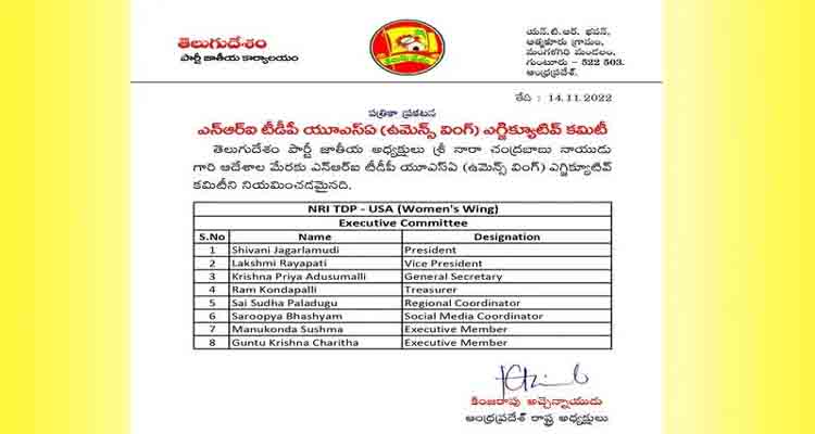 ఎన్నారై టీడీపీ యూఎస్ఏ శాఖ మహిళా విభాగానికి కొత్త ఎగ్జిక్యూటివ్ కమిటీ సభ్యులు నియమితులయ్యారు. తెలుగుదేశం పార్టీ జాతీయ అధ్యక్షులు నారా చంద్రబాబు నాయుడు ఆదేశాల మేరకు కొత్త సభ్యులను నియమిస్తూ పార్టీ రాష్ట్ర అధ్యక్షులు కింజరాపు అచ్చెన్నాయుడు తాజాగా ఆదేశాలు జారీ చేశారు. కొత్త కమిటీకి ప్రెసిడెంట్గా శివానీ జాగర్లమూడి ఎంపికయ్యారు. వైస్ ప్రెసిడెంట్గా లక్ష్మి రాయపాటి, జనరల్ సెక్రెటరీగా కృష్ణ ప్రియ అడుసుమల్లి, కోశాధికారిగా రామ్ కొండపల్లి, రీజినల్ కోర్డినేటర్గా సాయి సుధ పాలడుగు, సోషల్ మీడియా కోఆర్డినేటర్గా సారూప్య భాష్యం, ఎగ్జిక్యూటివ్ మెంబర్లుగా మనుకొండ సుష్మ, గుంటు కృష్ణ చరిత నియమితులయ్యారు.