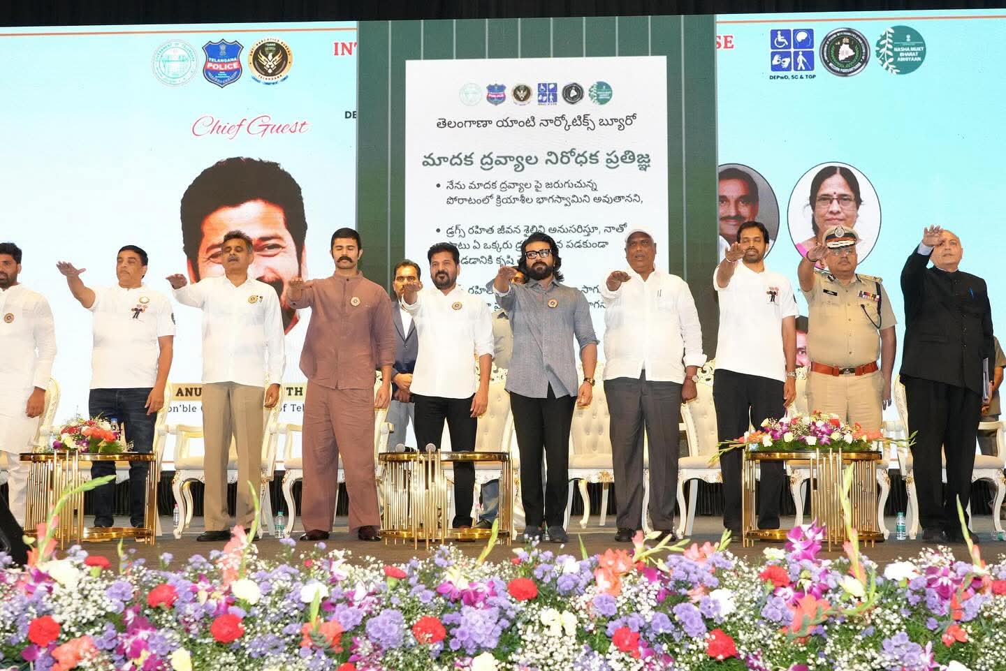 అంతర్జాతీయ మాదక ద్రవ్యాల వ్యతిరేక దినం సందర్భంగా EAGLE ఆధ్వర్యంలో శిల్పకళా వేదికలో ఏర్పాటు చేసిన కార్యక్రమంలో పాల్గొన్న సీఎం రేవంత్ రెడ్డి, సినీ నటులు రామ్ చరణ్, విజయ్ దేవరకొండ, TFDC చైర్మన్ శ్రీ దిల్ రాజు, పుల్లెల గోపీచంద్ ఇతర ప్రముఖులు