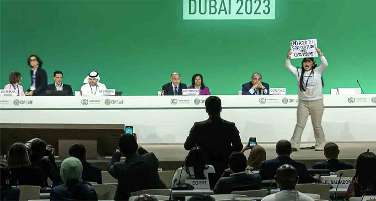దుబాయ్లో జరుగుతున్న కాప్-28 సమావేశాల్లో కలకలం చెలరేగింది. మణిపూర్కు చెందిన లిసిప్రియా కాంగుజమ్ అనే 12 ఏళ్ల బాలిక అకస్మాత్తుగా చర్చా వేదికపైకి వచ్చి పెట్రోల్, డీజిల్ వంటి శిలాజ ఇంధనాల వాడకానికి వ్యతిరేకంగా నినాదాలు చేసింది. అంతేగాక శిలాజ ఇంధనాలకు వ్యతిరేకంగా వేదికపై ప్లకార్డును ప్రదర్శించింది. శిలాజ ఇంధనాల విచ్చలవిడి వాడకం కారణంగా భూమి సగటు ఉష్ణోగ్రతలు అంతకంతకే పెరిగిపోతున్నాయి. అంతేకాదు, ఈ పరిణామం ఫలితంగా భవిష్యత్తులో అనూహ్యమైన వాతావరణ మార్పులు చోటుచేసుకుంటాయని, సముద్ర మట్టాలు పెరిగిపోయి తీర ప్రాంతాల్లోని ముంబై వంటి నగరాలు మునిగిపోతాయని శాస్త్రవేత్తలు చాలాకాలం నుంచి హెచ్చరిస్తున్నారు. ఈ నేపథ్యంలో లిసిప్రియ శిలాజ ఇంధనాలపై తన వ్యతిరేకతను స్పష్టంచేస్తూ నినాదాలు చేయడంతో కొంత సమయం అక్కడ గందరగోళం నెలకొంది.