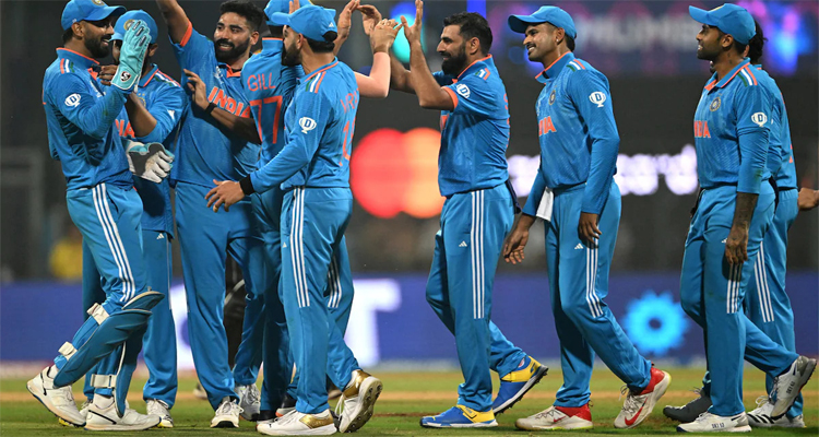 ప్రపంచకప్లో భారత్ దూసుకు వెళ్లింది. న్యూజిలాండ్ తో జరిగిన సెమీ ఫైనల్ మ్యాచ్ లో 70 పరుగుల తేడాతో ఘనవిజయం సాధించింది. 398 పరుగుల విజయ లక్ష్యంతో బరిలోకి దిగిన న్యూజిలాండ్ 327 పరుగులకు అలౌట్ అయింది. .ఈ మ్యాచ్ లో షమీ ఏడు. వికెట్లు తీసి కివీస్ పతనాన్ని శాసించాడు. 397 పరుగుల లక్ష్యఛేదనలో న్యూజిలాండ్, 48.5 ఓవర్లలో 327 పరగులకి ఆలౌట్ అయ్యింది. వాంఖడే వేదికగా న్యూజిలాండ్తో జరిగిన సెమీస్లో టాస్ గెలిచి మొదట బ్యాటింగ్కు వచ్చిన భారత్ విరాట్ కోహ్లీ (113 బంతుల్లో 117, 9 ఫోర్లు, 2 సిక్సర్లు) శ్రేయస్ అయ్యర్ (70 బంతుల్లో 105, 4 ఫోర్లు, 8 సిక్సర్లు) చేయడంతో నిర్ణీత 50 ఓవర్లలో నాలుగు వికెట్లు మాత్రమే కోల్పోయి 397 పరుగుల భారీ స్కోరు చేసింది. ఈ ఇద్దరితో పాటు ఇన్నింగ్స్ ఆరంభించిన రోహిత్ శర్మ (29 బంతుల్లో 47, ఫోర్లు, సిక్సర్లు) ధాటిగా ఆడగా శుభ్మన్ గిల్ (66 బంతుల్లో 79 నాటౌట్, 8 ఫోర్లు, 3 సిక్సర్లు) కూడా రాణించడంతో కివీస్ ఎదుట భారత్ భారీ లక్ష్యాన్ని నిలిపింది.