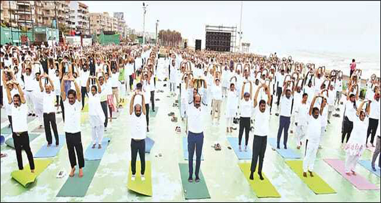 అంతర్జాతీయ యోగా దినోత్సవానికి విశాఖ సాగరతీరం ముస్తాబయింది. రికార్డు స్థాయిలో ఒకేచోట ఐదు లక్షల మంది యోగాసనాలు వేసేలా అవసరమైన ఏర్పాట్లు జరుగుతున్నాయి. ఆర్కే బీచ్ నుంచి భీమిలి వరకు 26. కి.మీ. పరిధిలో బారికేడ్లు, రహదారిపై మ్యాట్లు, విద్యుద్దీపాలు, ఎల్ఈడీ స్క్రీన్లు, శిక్షకులకు వేదికలు ఇలా సర్వం సిద్ధం చేశారు. ఈ నెల 21వ తేదీ ఉదయం 6.25 గంటలకు యోగాంధ్ర`2025 కార్యక్రమం ప్రారంభమవుతుంది. ఉదయం 6:30 గంటల నుంచి 7 గంటల వరకు అతిథులు ప్రసంగించనున్నారు. తొలుత కేంద్ర ఆయుష్ శాఖ మంత్రి స్వాగతోపన్యాసం చేస్తారు. ఆ తర్వాత 6:45 నిమిషాల వరకు ముఖ్యమంత్రి, ఉపముఖ్యమంత్రి ప్రసంగిస్తారు. ప్రధాని మోదీ 15 నిమిషాలు ప్రసంగించనున్నారు. ఏడు గంటలకు ఆసనాలు ప్రారంభించి 7:45 వరకు నిర్వహిస్తారు.