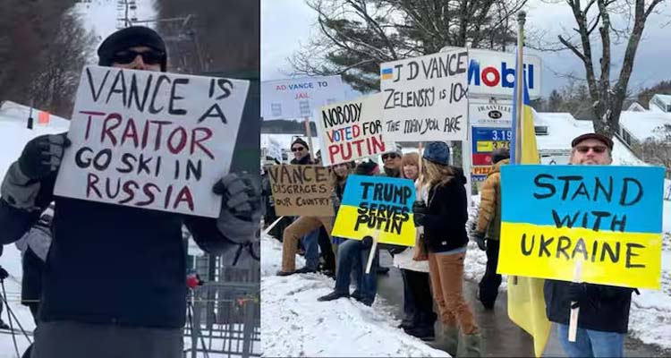 ఈ క్రమంలో అమెరికా ఉపాధ్యక్షుడు జేడీ వాన్స్‌కు నిరసన సెగ తగిలింది. జేడీ వాన్స్‌ తన కుటుంబంతో కలిసి స్కీ హాలిడే కోసం వెర్మోంట్‌ కు వెళ్లారు. అక్కడ స్థానికులు ఉక్రెయిన్‌ అనుకూల ప్లకార్డులను పట్టుకుని ఉపాధ్యక్షుడికి స్వాగతం పలికారు. ఉపాధ్యక్షుడి పర్యటనను వ్యతిరేకిస్తూ వెర్మోంట్‌లోని వెయిట్స్‌ఫీల్డ్‌లో వందలాది మంది నిరసనకారులు ఒకచోట చేరి నిరసన తెలిపారు. వెర్మోంట్ స్టాండ్‌ విత్‌ ఉక్రెయిన్‌  వంటి ప్లకార్డులతోపాటు ఉక్రేనియన్‌ జెండాలను ప్రదర్శించారు. ఈ నిరసనలతో వాన్స్‌ కుటుంబం స్కీ రిసార్ట్‌ నుంచి తెలియని ప్రదేశానికి వెళ్లాల్సి వచ్చింది.