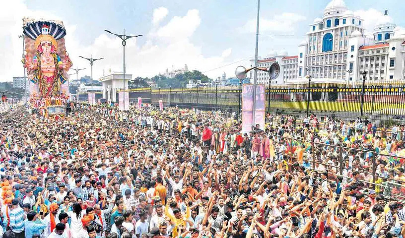 హైదరాబాద్లో గణేష్ మహా శోభాయాత్ర కన్నులపండువగా సాగింది. దీంతో ట్యాంక్బండ్పై సందడి మొదలైపోయింది. 9రోజులపాటు భక్తుల పూజలందుకున్న ఖైరతాబాద్ గణనాథుడి గంగమ్మ ఒడికి చేరాడు. హస్సేన్ సాగర్ వద్ద ఏర్పాటు చేసిన నాలుగో నెంబర్ భారీ క్రేన్ సాయంతో నిమజ్జనం కార్యక్రమం పూర్తి చేశారు. ఖైరతాబాద్ గణనాథుడి శోభాయాత్రకు చిన్నాపెద్ద తేడా లేకుండా, లక్షలాది మంది భక్తులు హాజరయ్యారు. గణపతిబప్ప మోరియా.. ఖైరతాబాద్ గణేష్కు జై అంటూ డ్యాన్సులు వేస్తూ గణనాథుడ్ని సాగనంపారు. ఎటు చూసినా జనసంద్రమే, ఇసుకేస్తే రాలనంత జనంతో ట్యాంక్ బండ్ పరిసరాలు కిటకిటలాడాయి. ఖైరతాబాద్ గణేశ్ ఎదుట భక్తులతో పాటు.. పోలీసులు కూడా డ్యాన్స్ వేసి అందరినీ ఆకట్టుకున్నారు. శ్రీ దశమహా విద్యాగణపతిగా కొలువైన ఖైరతాబాద్ గణేశుడి శోభాయత్ర టెలిఫోన్ భవన్, సచివాలయం మీదుగా శోభాయాత్ర కొనసాగింది.