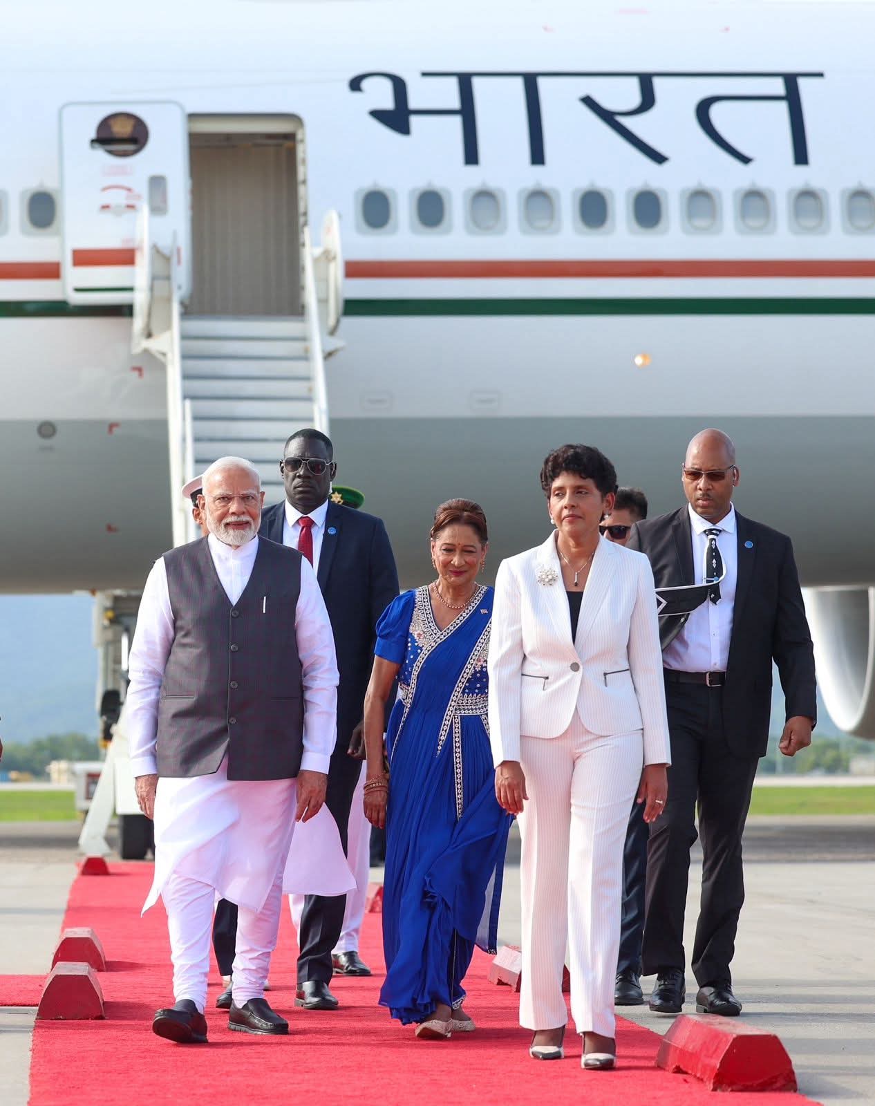 PM Modi Landed in Port of Spain, Trinidad & Tobago welcomed by Prime Minister Kamla Persad-Bissessar