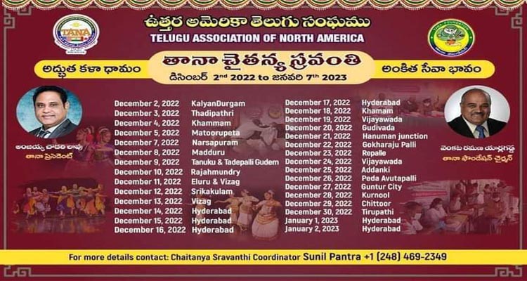 ప్రపంచం కోవిడ్ మహమ్మారి  నుంచి కోలుకున్న తరువాత, “అంకిత సేవా భావం, అద్భుత కళా  ధామం”, అనే నినాదంతో,   ‘తానా’ చైతన్య స్రవంతి ఉభయ తెలుగు రాష్ట్రాలలో డిసెంబర్ 2nd  2022 నుండి  జనవరి 7th 2023 వరకు  నిర్వహించడానికి శ్రీకారం చుట్టింది.