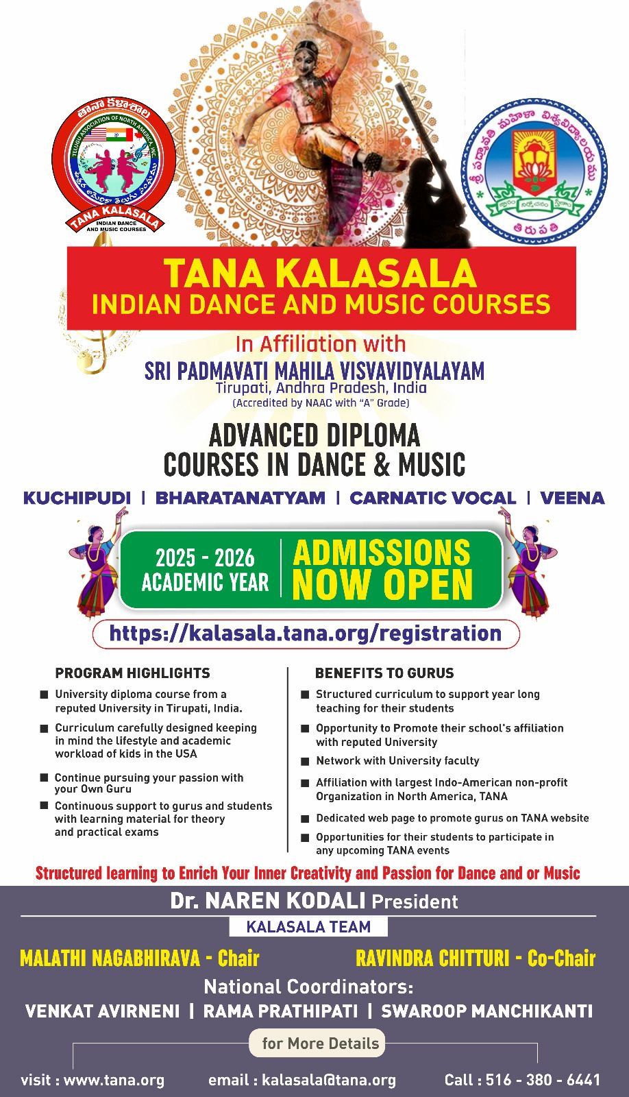 తెలుగు అసోసియేషన్ ఆఫ్ నార్త్ అమెరికా (తానా) ఆధ్వర్యంలో నిర్వహించబడుతున్న తానా కళాశాల – భారతీయ నృత్య మరియు సంగీత విద్యా కార్యక్రమానికి 2025–2026 విద్యాసంవత్సరానికి ప్రవేశాలు ప్రారంభమయ్యాయి. ఈ కార్యక్రమం తిరుపతిలోని శ్రీ పద్మావతి మహిళా విశ్వవిద్యాలయం (NAAC “A” గ్రేడ్) తో అనుబంధంగా నిర్వహించబడుతోంది.
