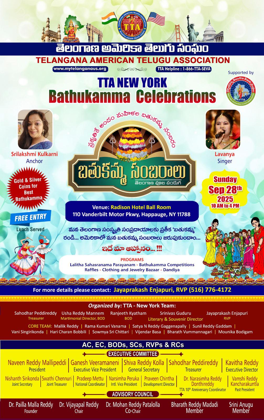 Telangana American Telugu Association (TTA) is proud to announce its signature, traditional event – Bathukamma/Dasara Celebrations 2025 — taking place nationwide under the leadership of TTA President Naveen Reddy Mallipeddi Garu.