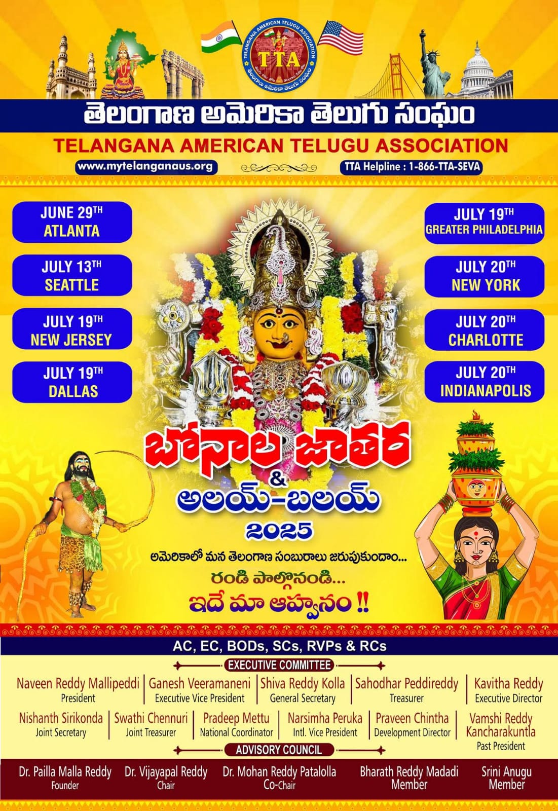 The most awaited traditional festival of Telangana is here – TTA Bonala Jatara. The Telangana American Telugu Association (TTA) is proudly celebrating Bonalu under the leadership of TTA President Naveen Reddy Mallipeddi Garu. Bonalu is a vibrant and deeply rooted festival that honors the Goddess Mahakali through colorful processions, traditional music and festive rituals. It is a true reflection of Telangana’s rich cultural heritage.