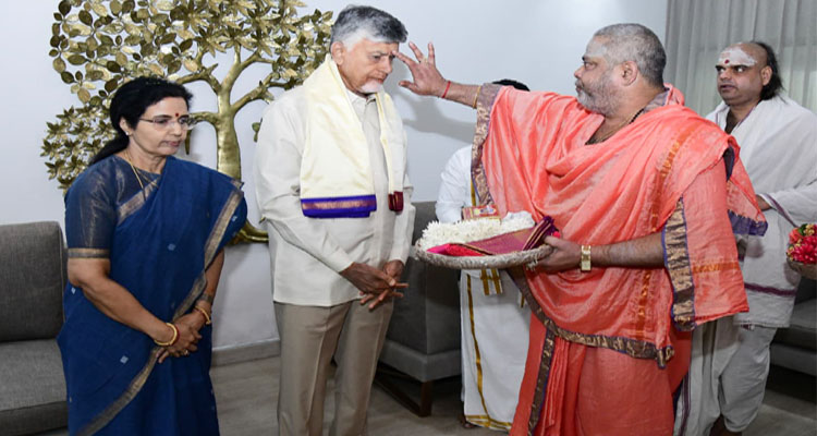 పుట్టిన రోజు సందర్భంగా ఆంధ్రప్రదేశ్ ముఖ్యమంత్రి నారా చంద్రబాబు నాయుడుకు క్యాంప్ కార్యాలయంలో టీటీడీ, దుర్గగుడి అర్చకులు ఆశీర్వచనం అందించారు. అనంతరం శ్రీ వేంకటేశ్వరస్వామి, శ్రీ దుర్గామల్లేశ్వరస్వామి వార్ల ప్రసాదం, చిత్రపటాలను అందించారు. ఈ కార్యక్రమంలో టీటీడీ అడిషనల్ ఈవో శ్రీ వెంకయ్యా చౌదరి, దుర్గగుడి ఈఓ శ్రీ శీనా నాయక్ తదితరులు పాల్గొన్నారు.