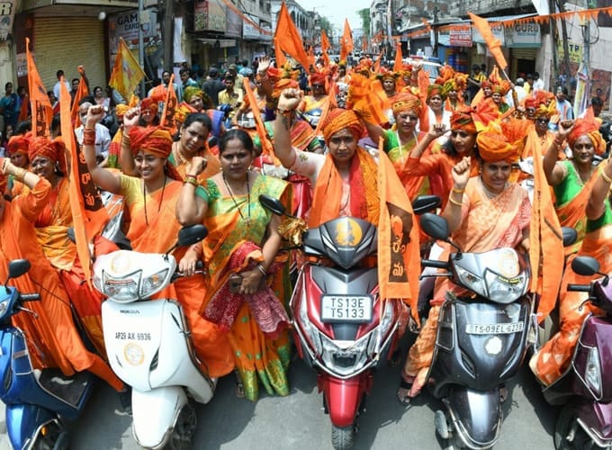 హనుమాన్ జయంతి సందర్భంగా హైదరాబాద్ లో శోభాయాత్ర లో బైక్ ర్యాలీలో పాల్గొన్న మహిళలు.